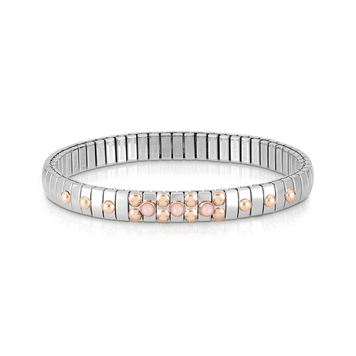 Elastyczna bransoletka wykonana ze stali szlachetnej z elementami z różowego złota 9K, zdobiona różowymi koralami